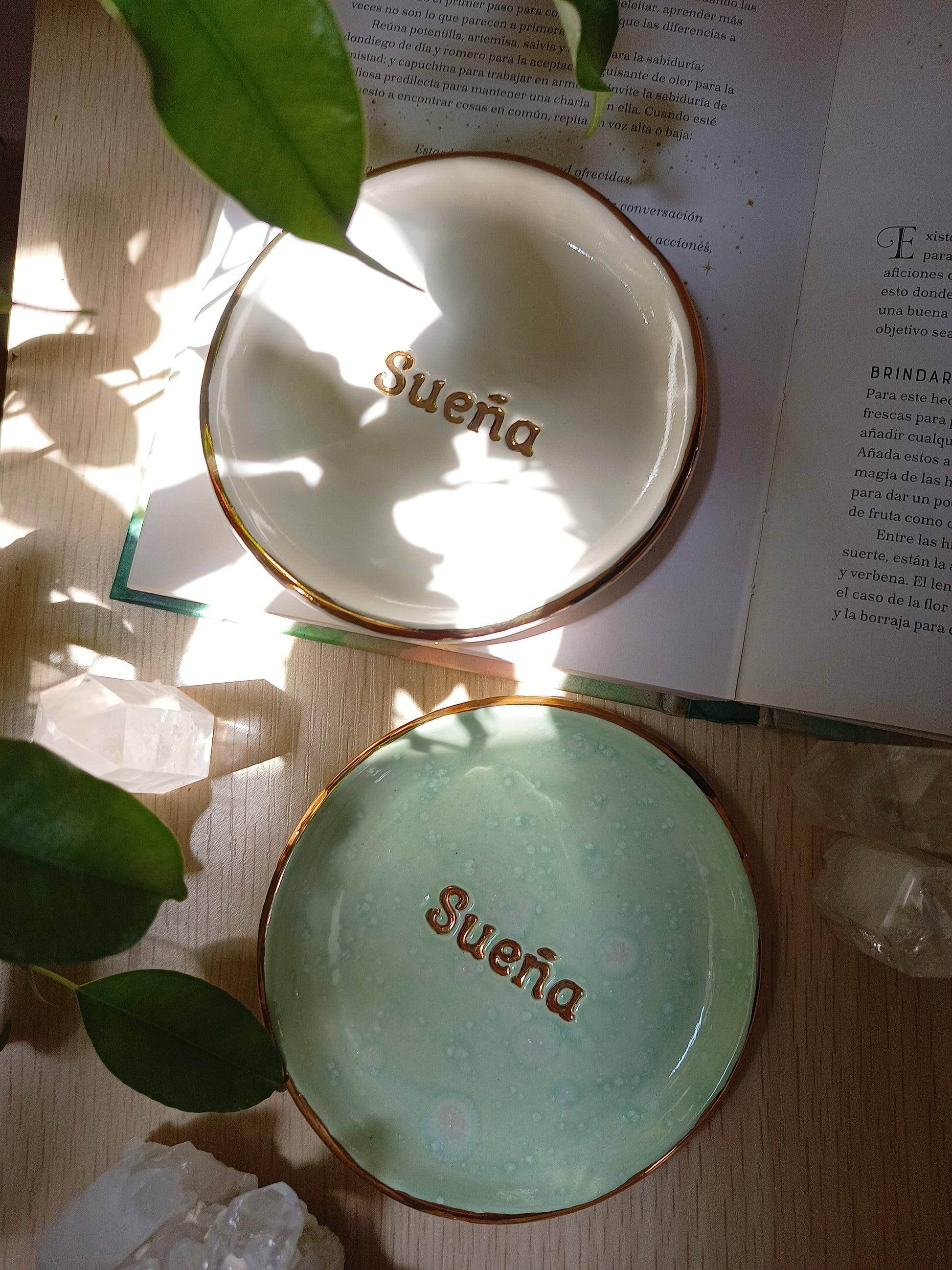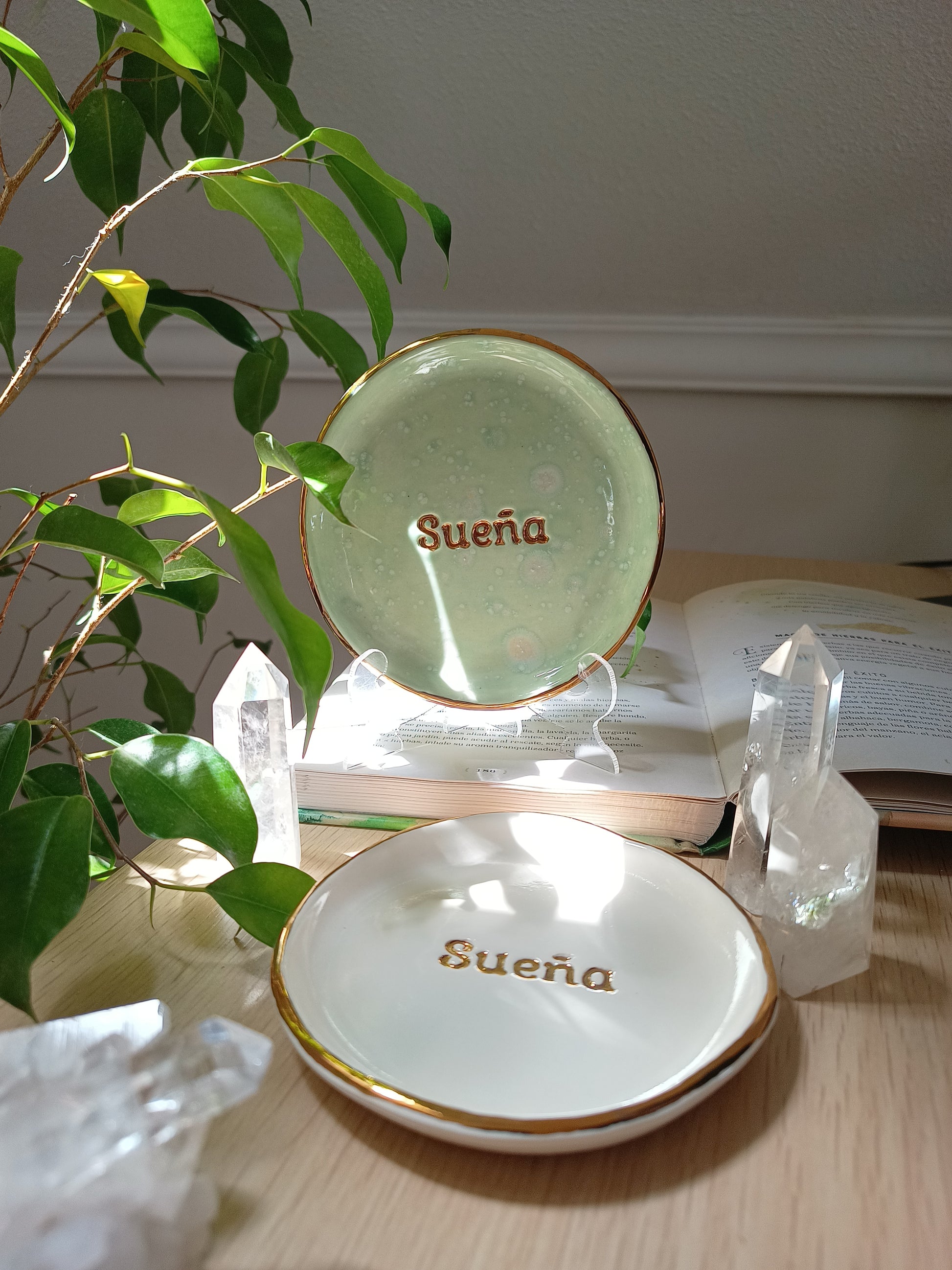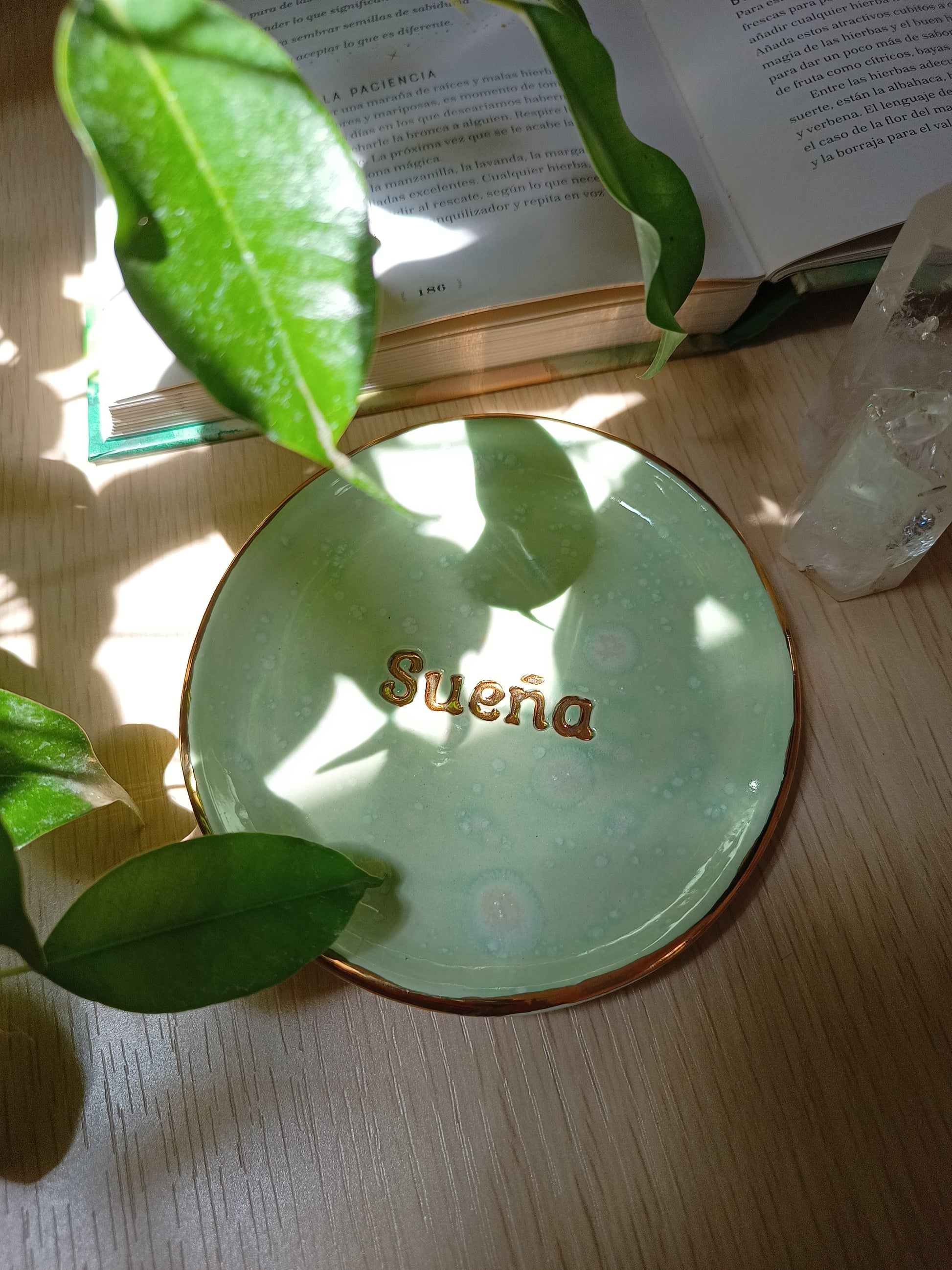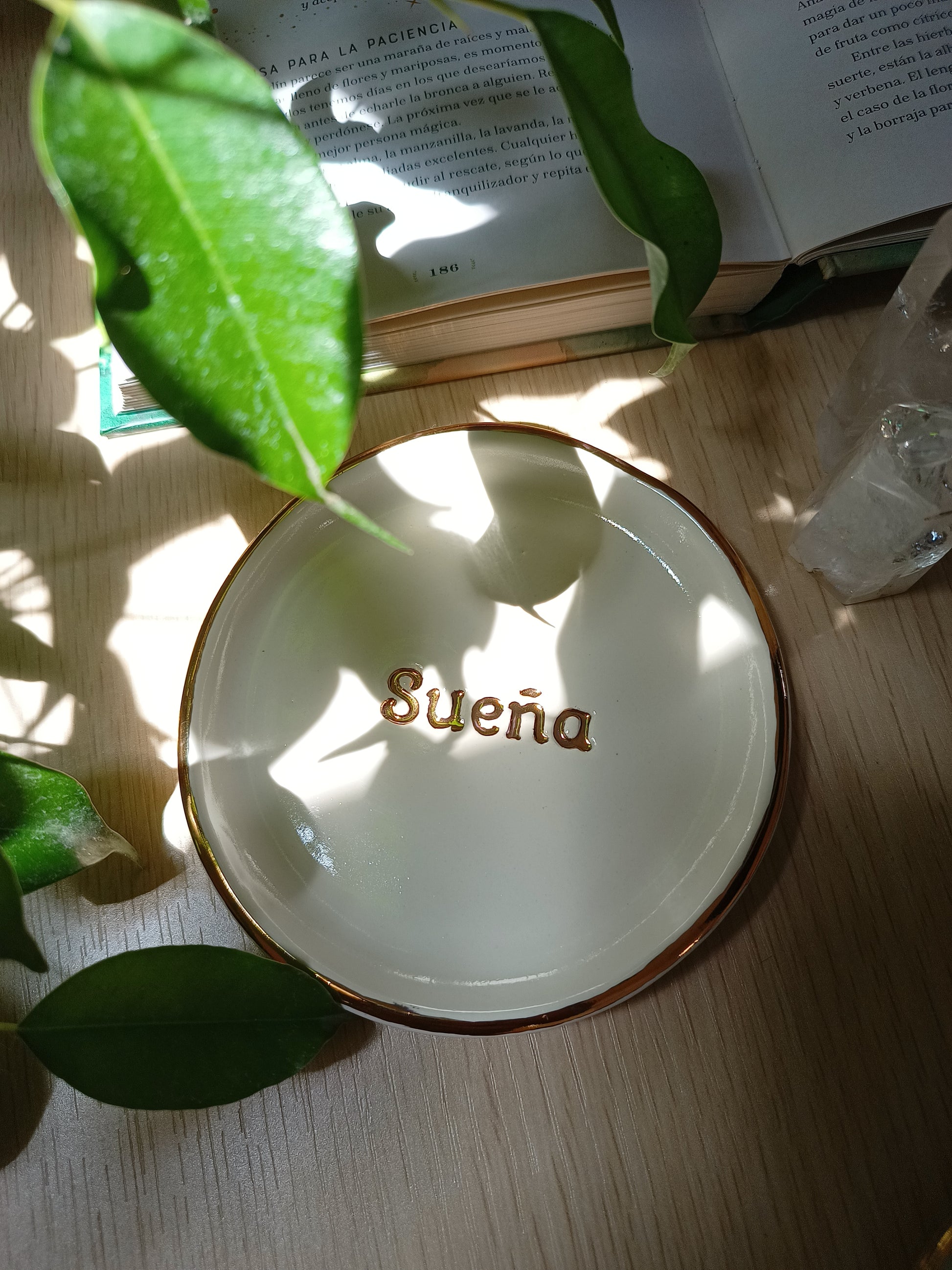 Siente la inspiración cada día con estos clásicos Platitos de Rocota, puedes usarlos como joyeros, para dejar tus llaves o solo para lucirlas en tu mesa de centro. Está hecha de cerámica de baja temperatura completamente a mano, con una bella palabra al centro y un borde reluciente en oro real ✨.