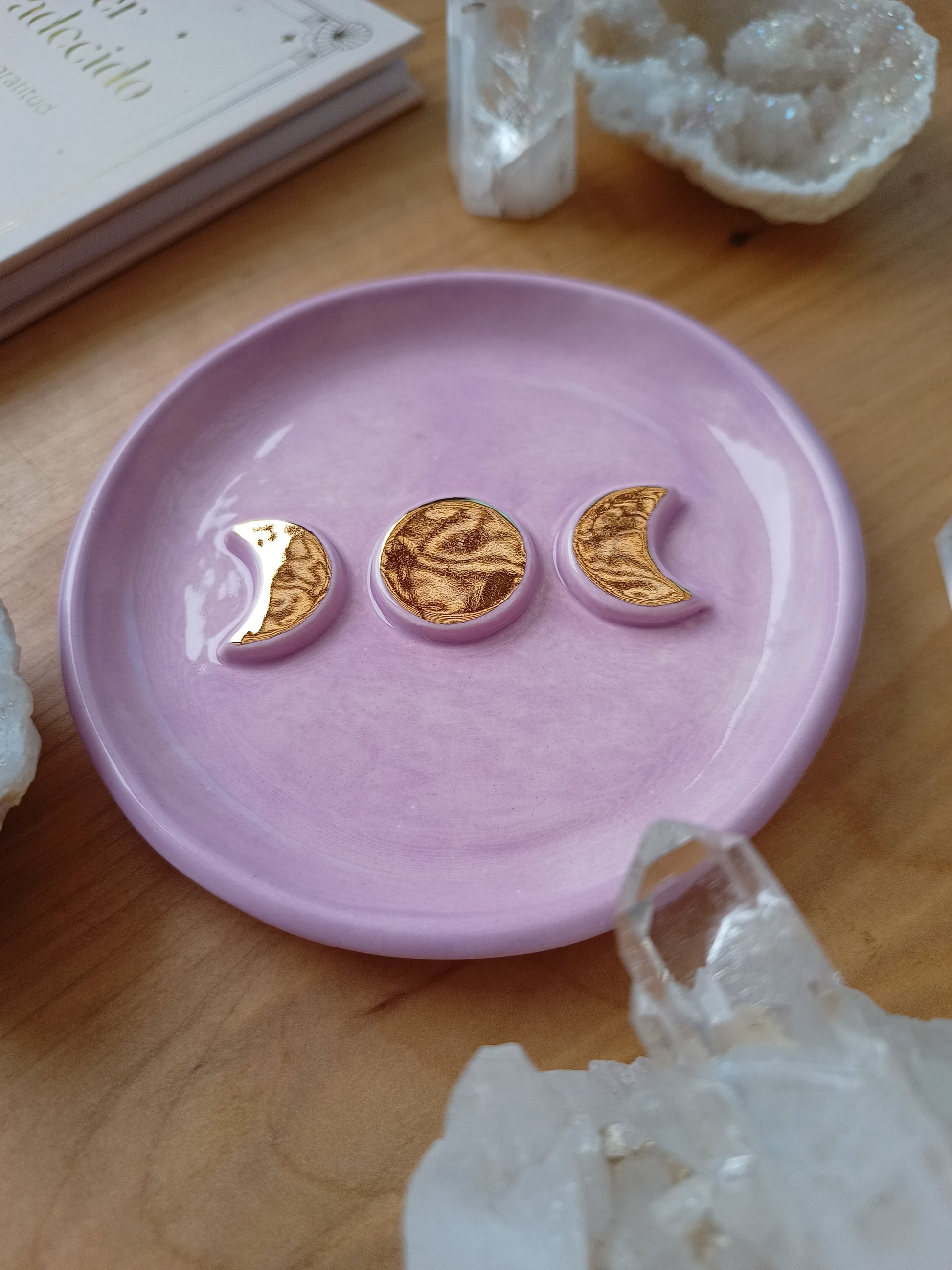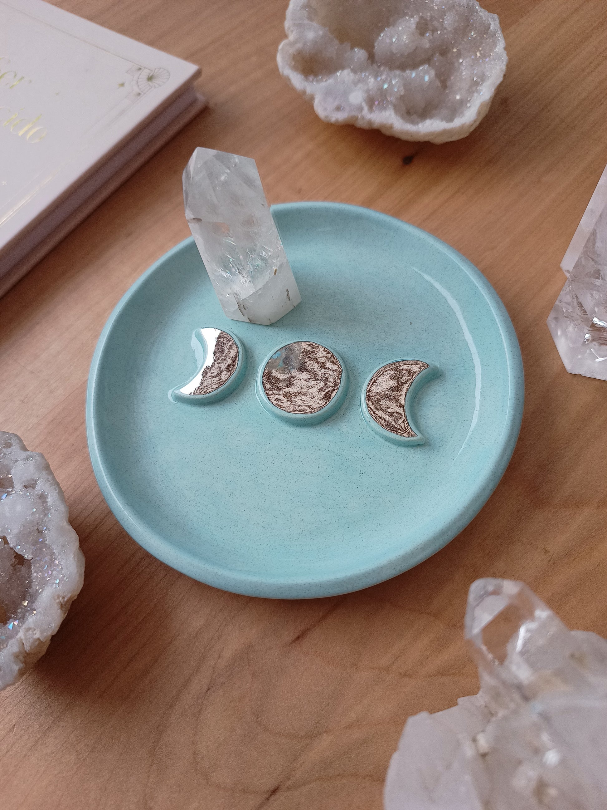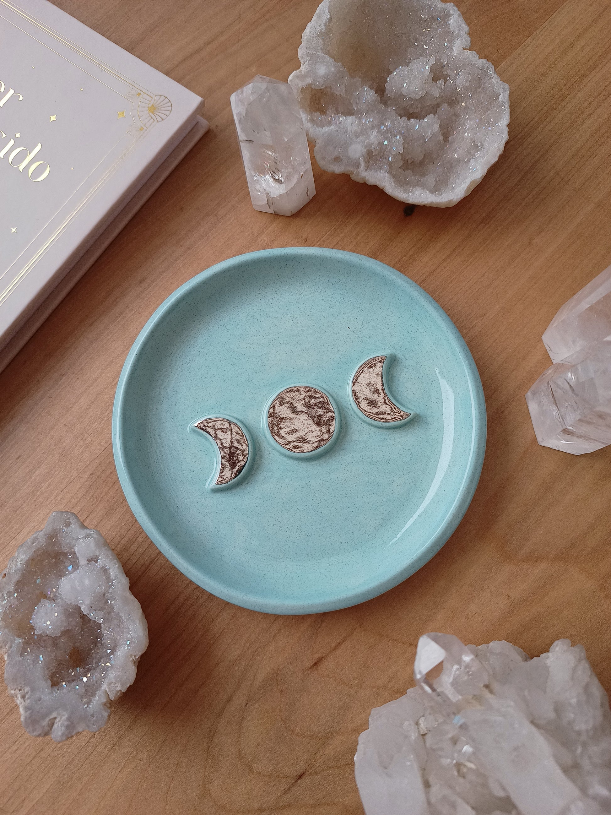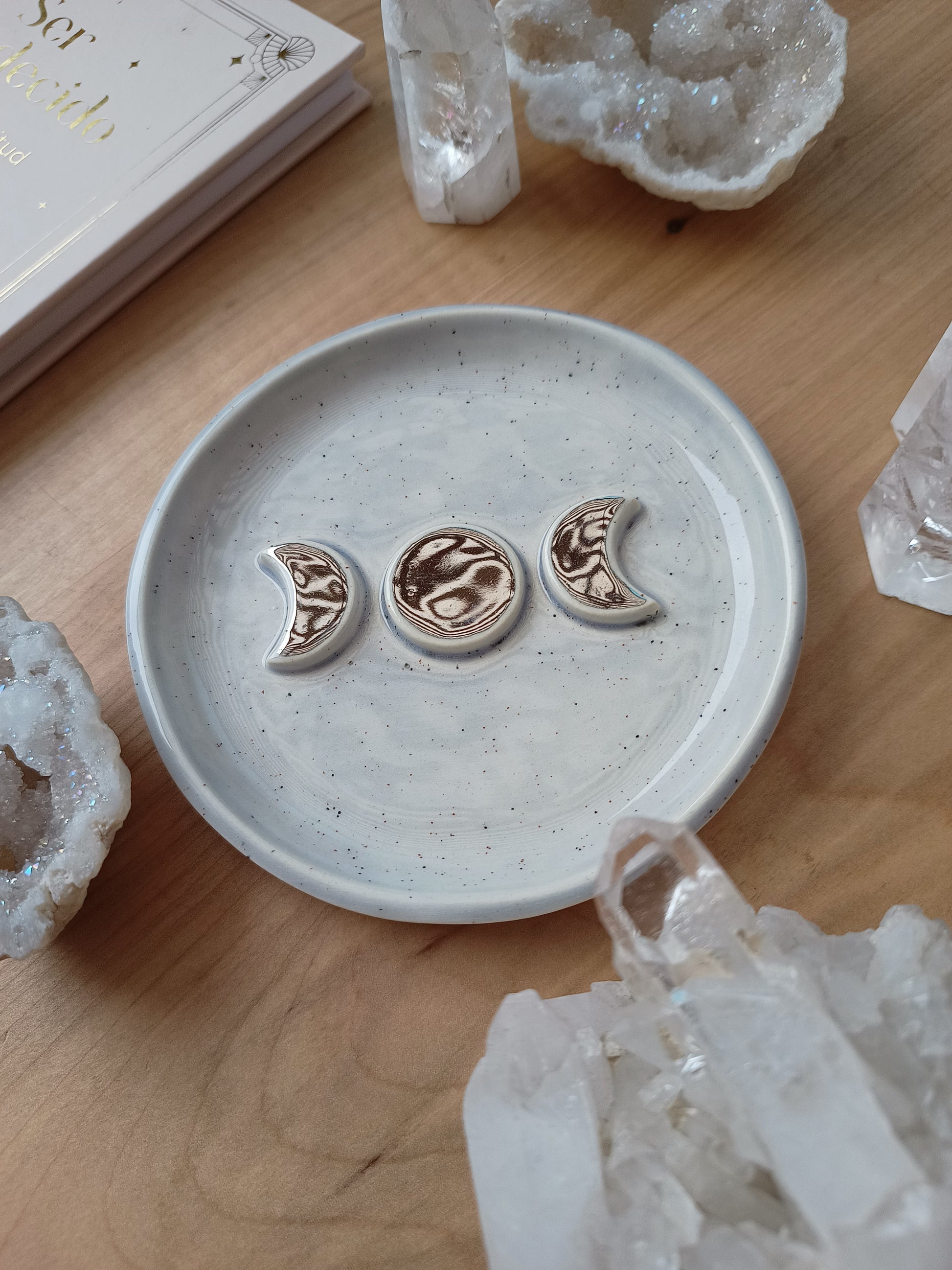 Este platito es una pieza ideal si amas las fases de nuestro hermoso satélite natural, puedes usarlo como joyero, para dejar tus cristales, quemar tu palo santo, o solo para lucirla en tu rincón especial. Está hecha de cerámica de baja temperatura, tiene detalles con lustre de oro, algunas con dorado y otras con plata ✨.