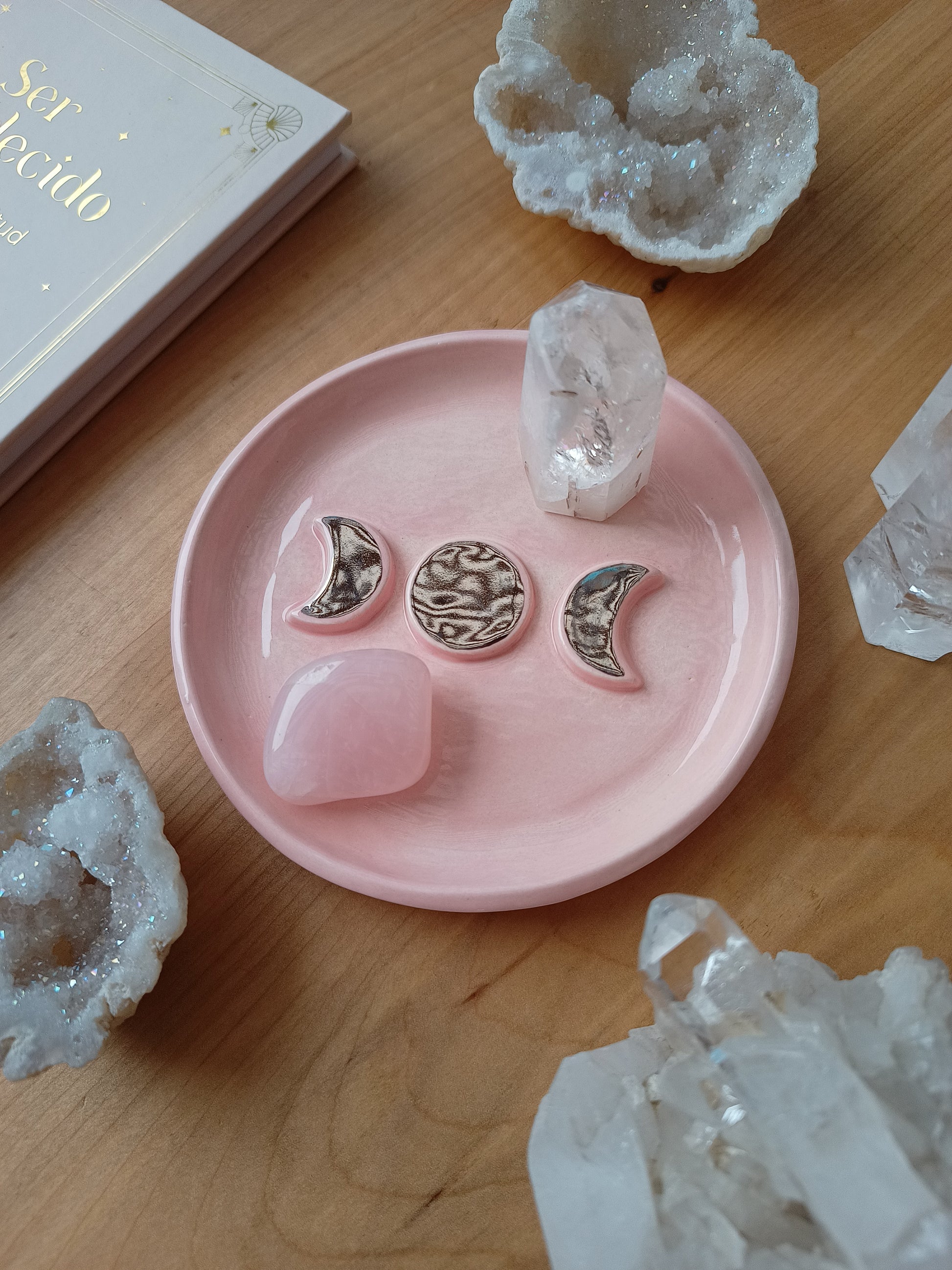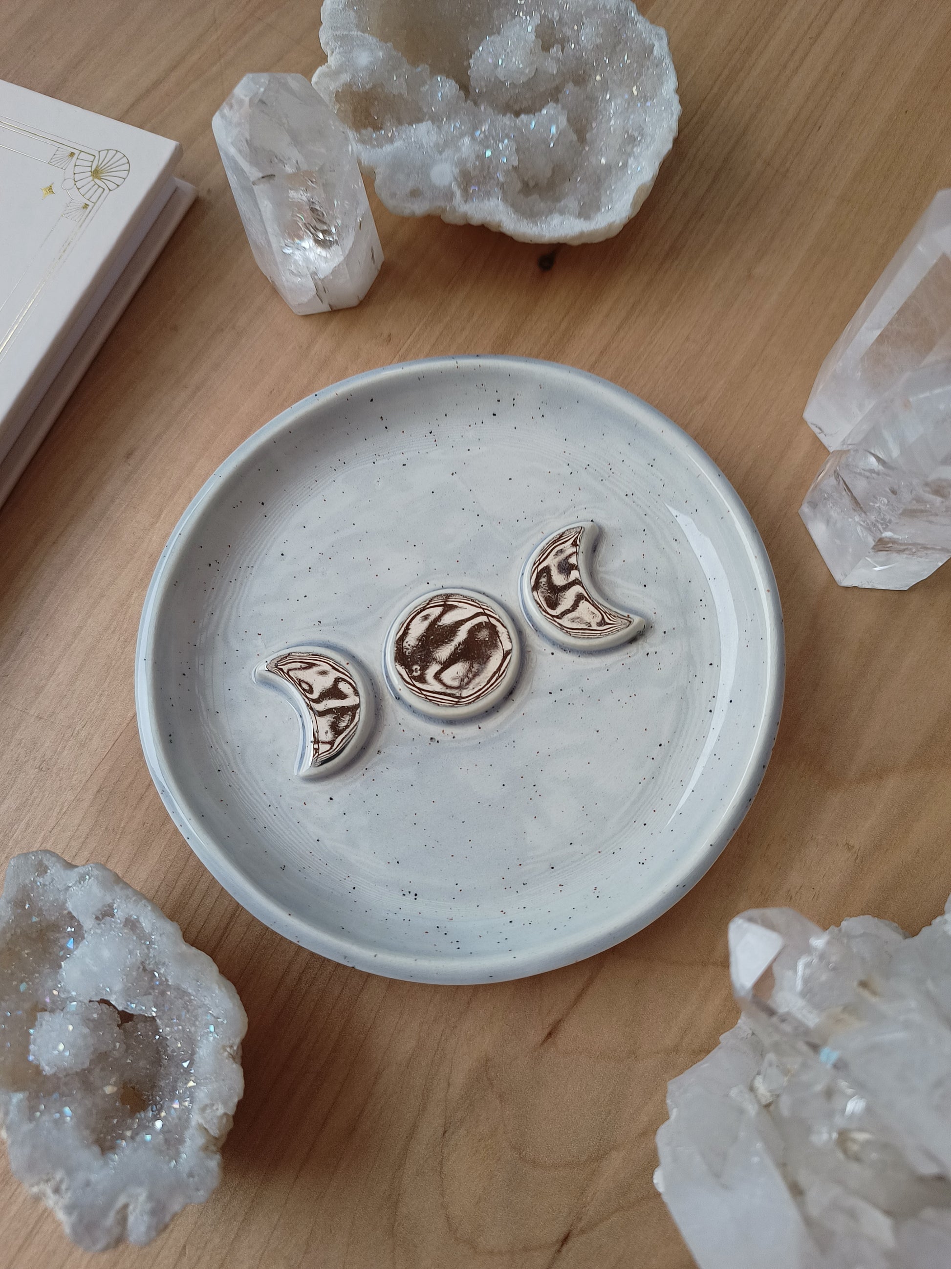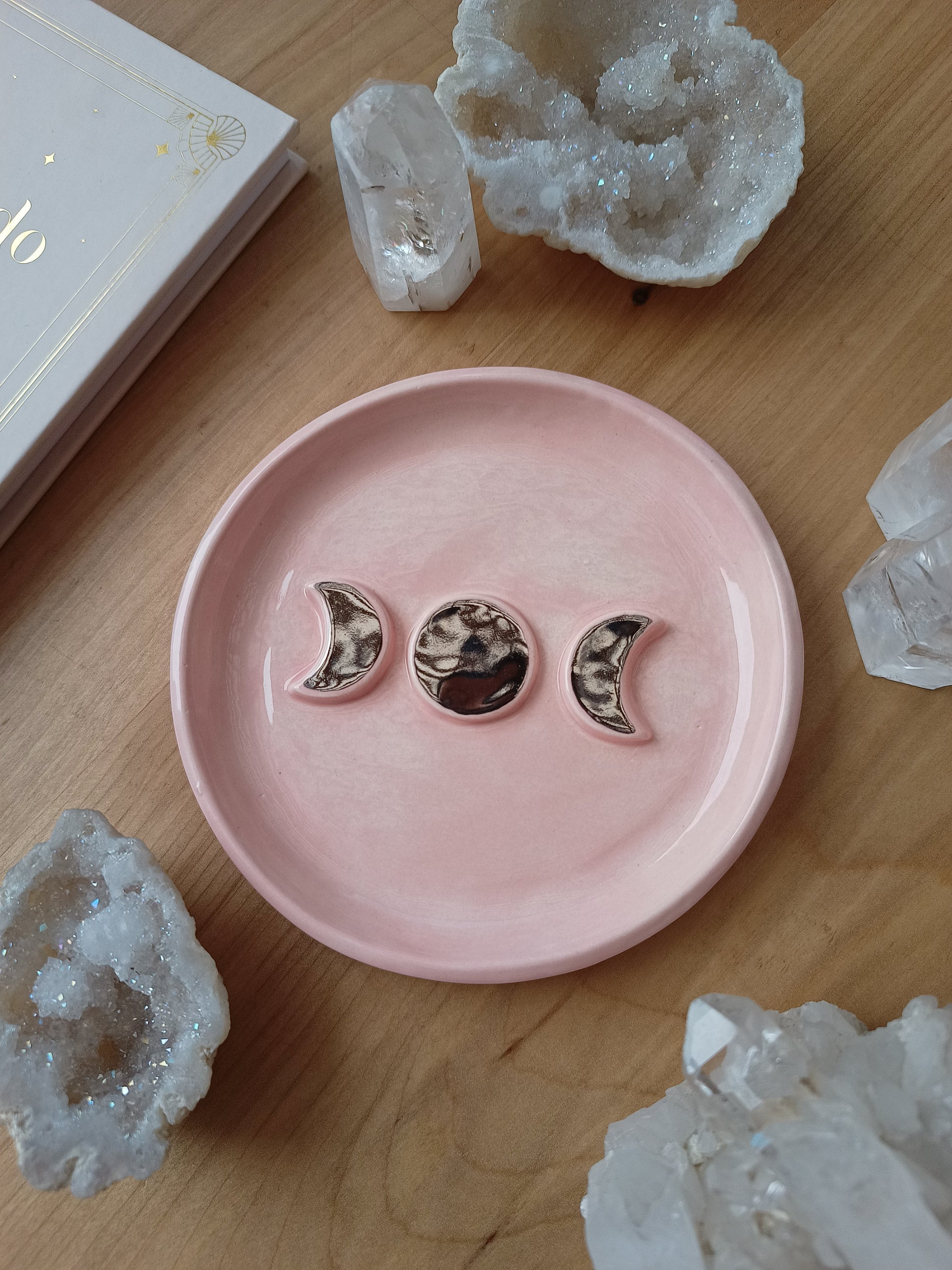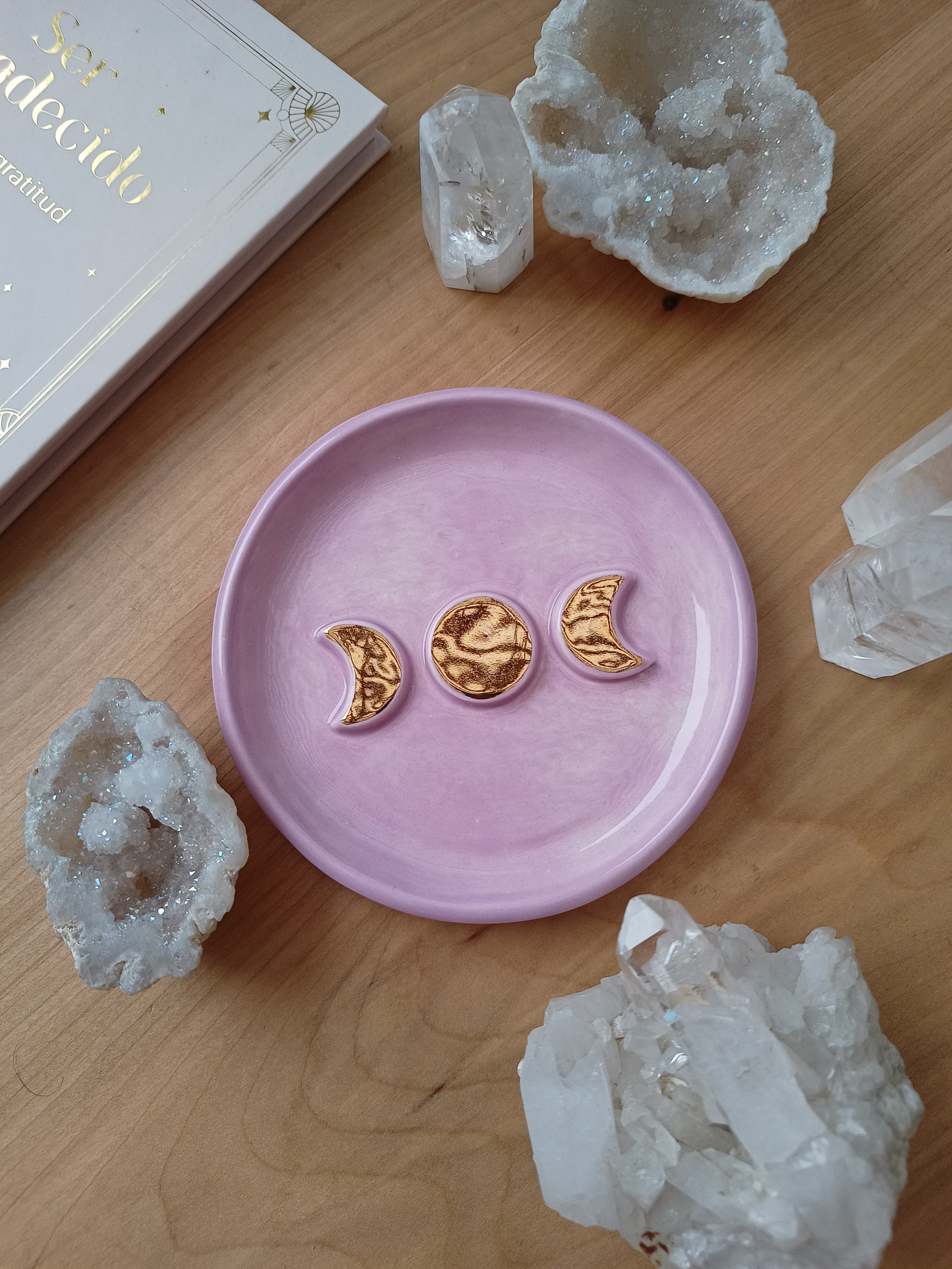 Este platito es una pieza ideal si amas las fases de nuestro hermoso satélite natural, puedes usarlo como joyero, para dejar tus cristales, quemar tu palo santo, o solo para lucirla en tu rincón especial. Está hecha de cerámica de baja temperatura, tiene detalles con lustre de oro, algunas con dorado y otras con plata ✨.