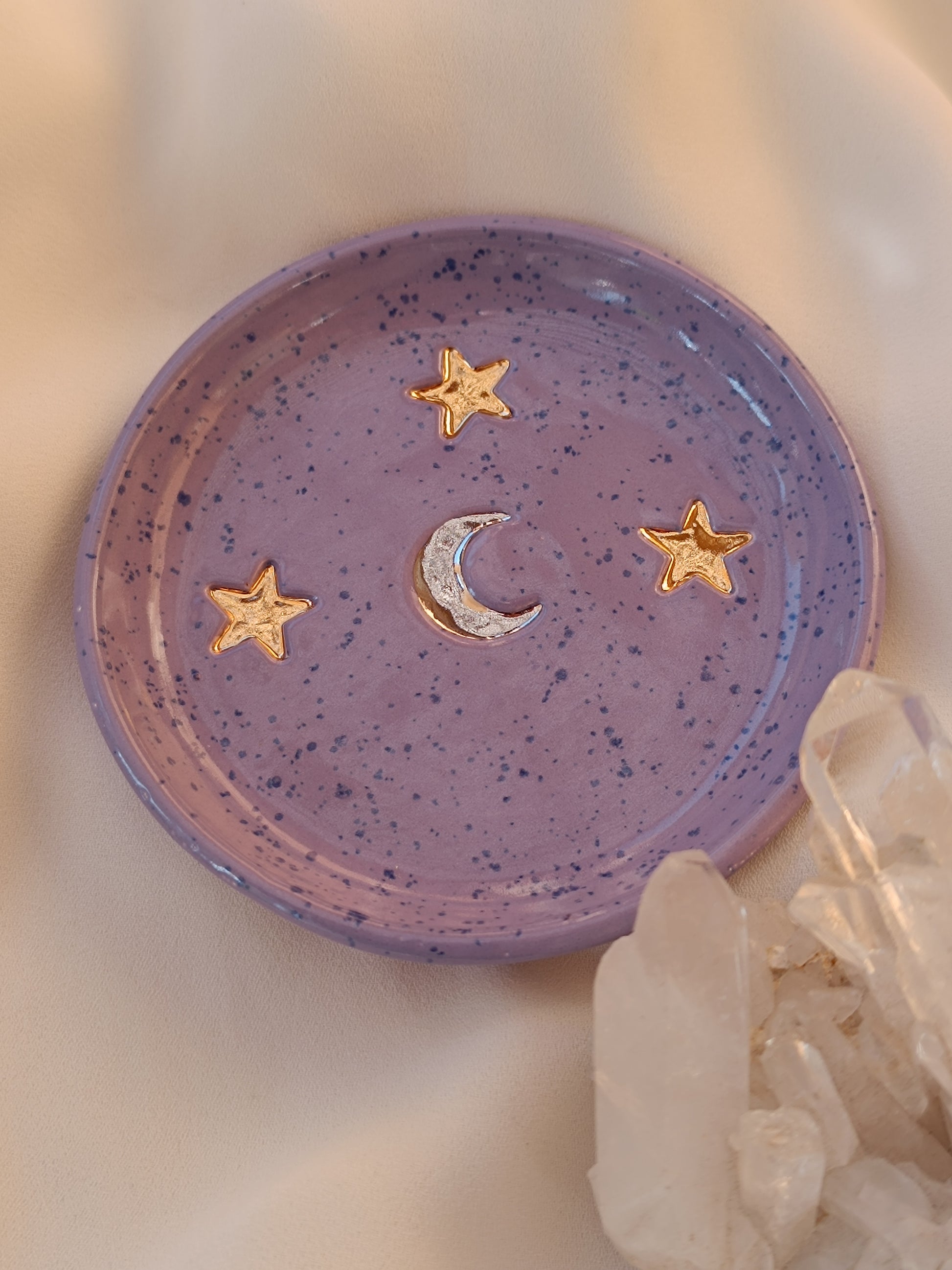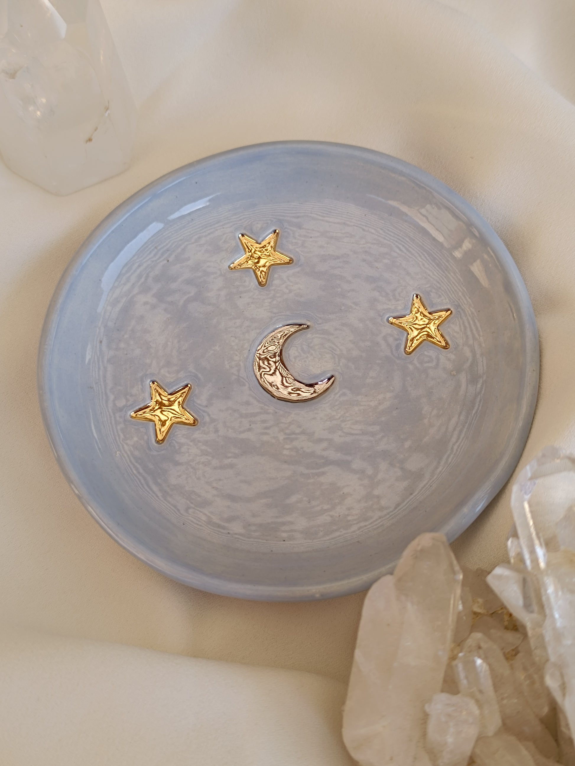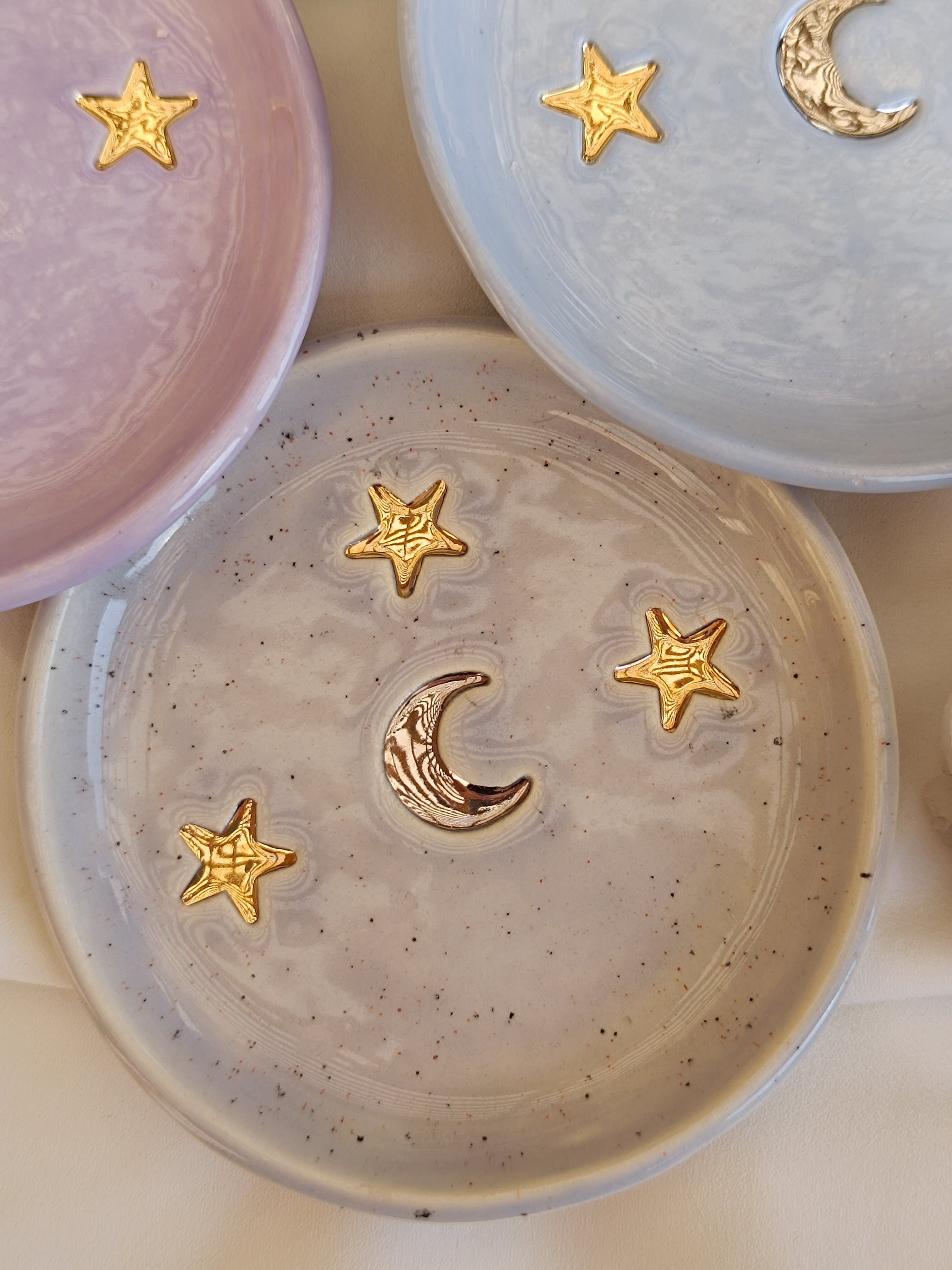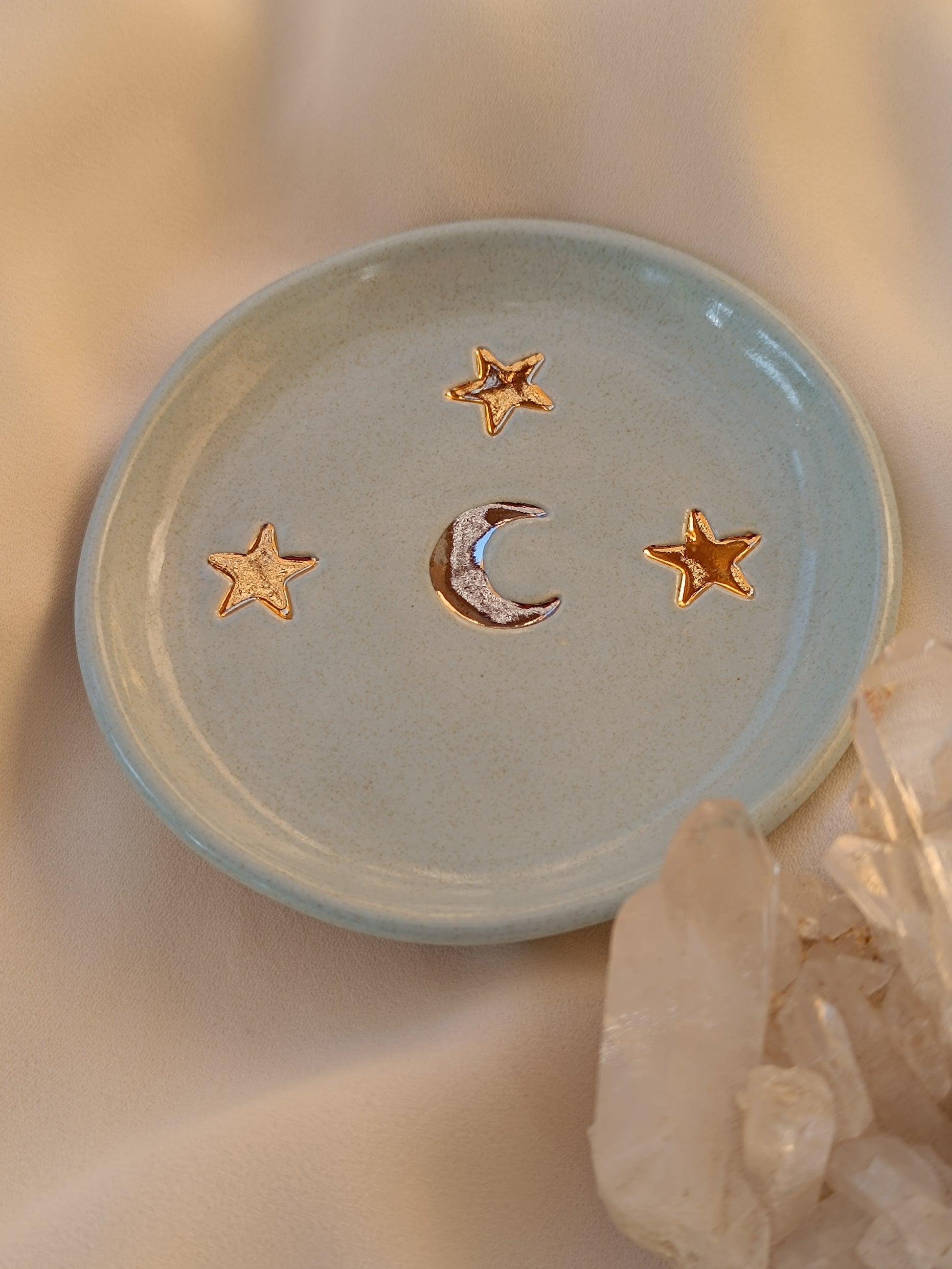 Este Platito es una pieza que te hará recordar una despejada noche de verano, puedes usarlo como joyero, para dejar tus llaves o solo para lucirla en tu mesa de centro. Está hecha de cerámica de baja temperatura, tiene una luna al centro esmaltada con lustre de oro blanco, y tres bellas estrellas con lustre de oro dorado. ✨