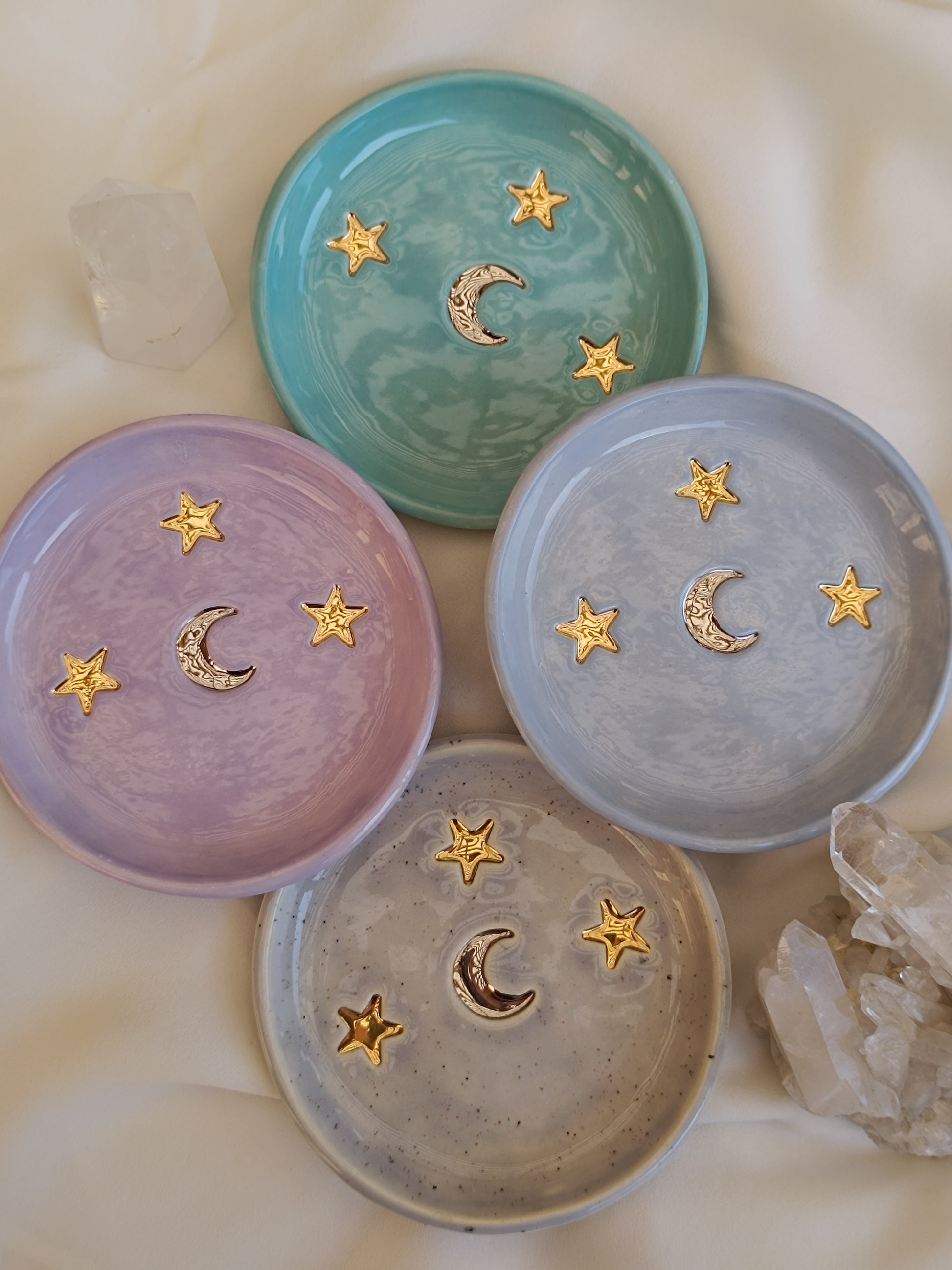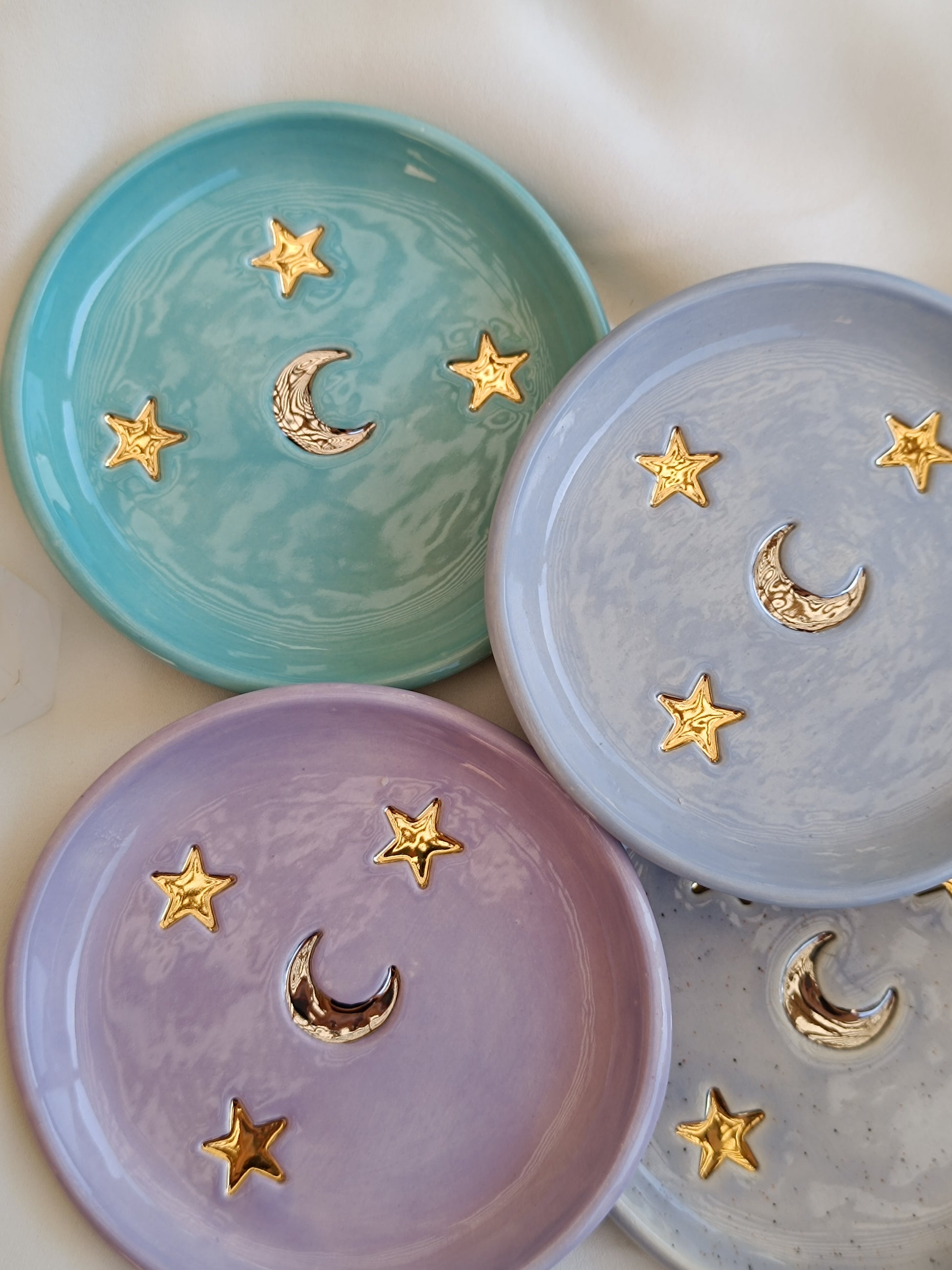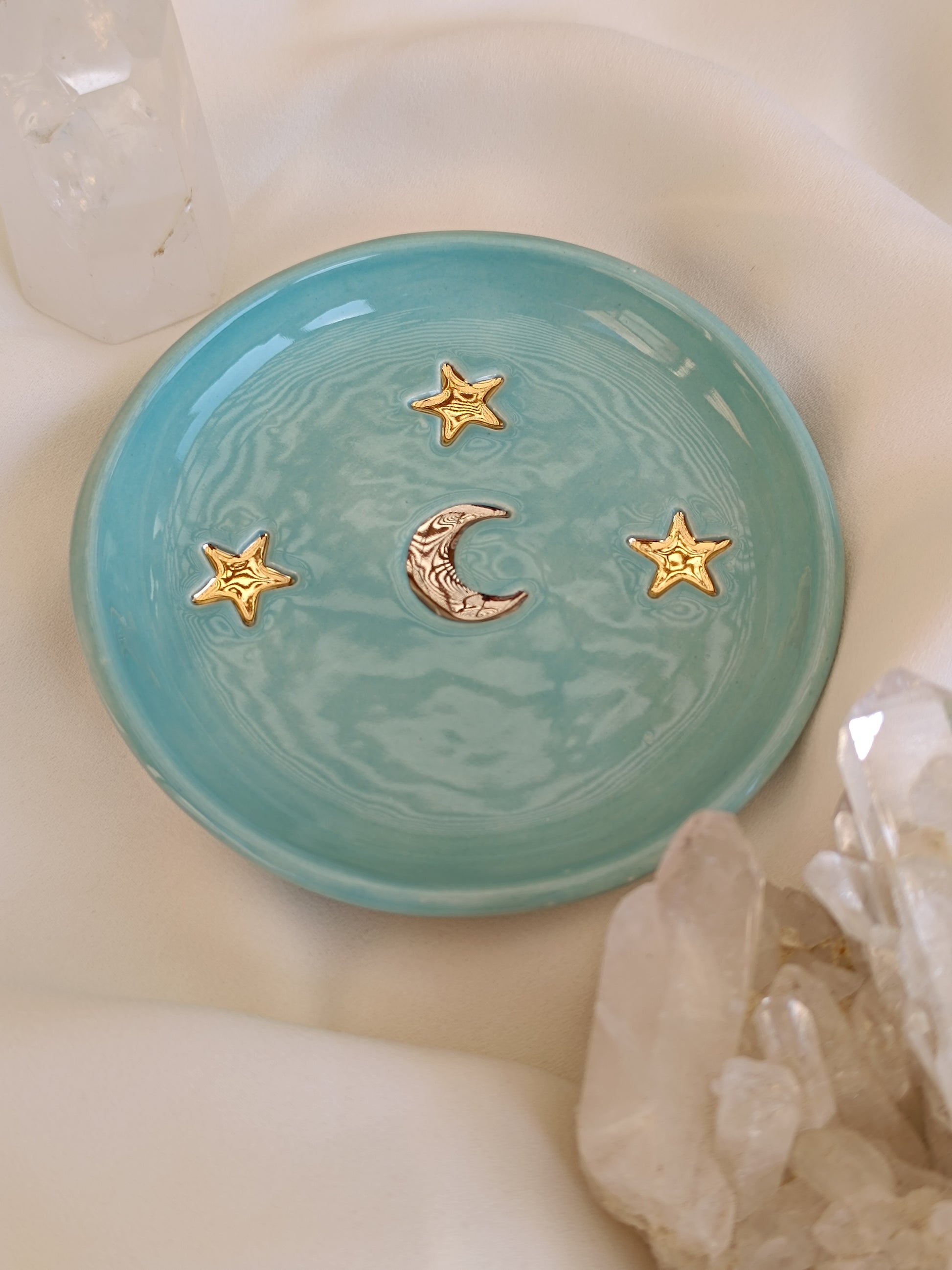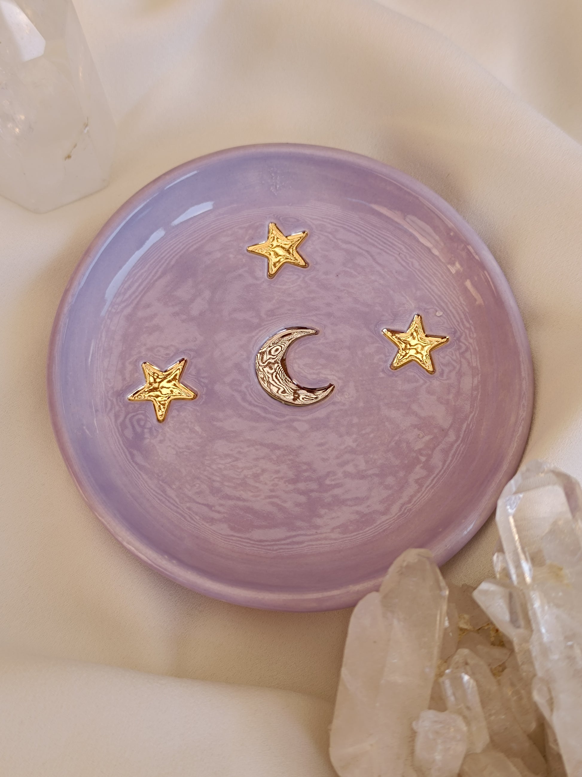 Este Platito es una pieza que te hará recordar una despejada noche de verano, puedes usarlo como joyero, para dejar tus llaves o solo para lucirla en tu mesa de centro. Está hecha de cerámica de baja temperatura, tiene una luna al centro esmaltada con lustre de oro blanco, y tres bellas estrellas con lustre de oro dorado. ✨