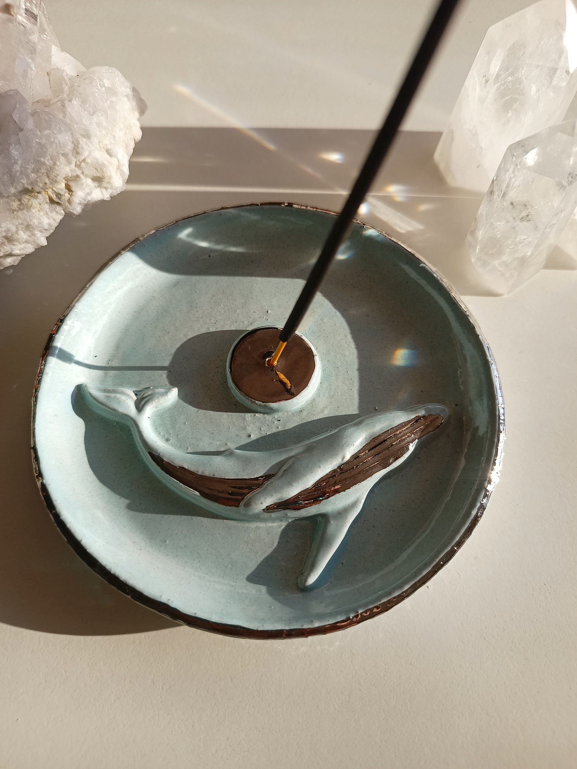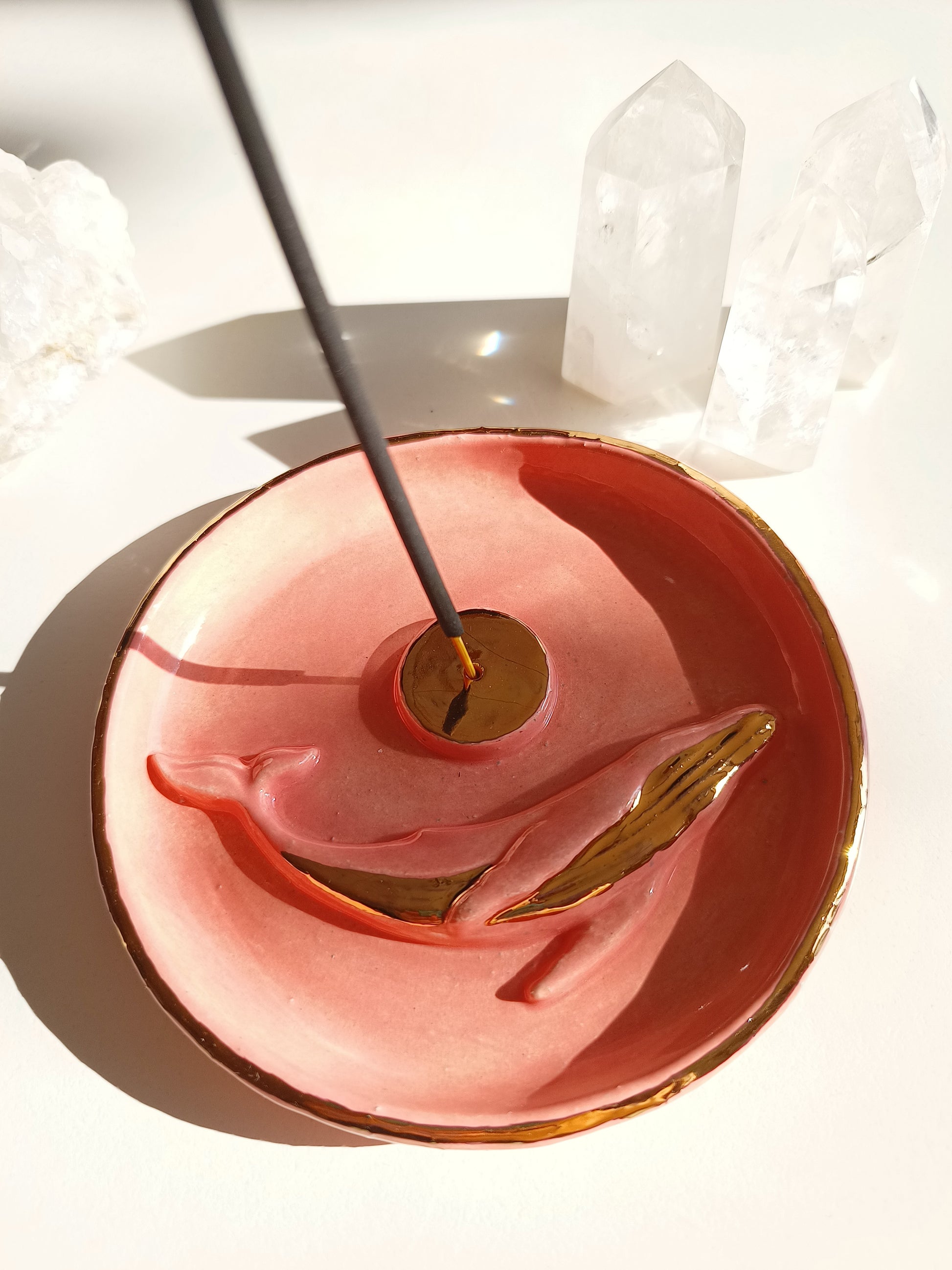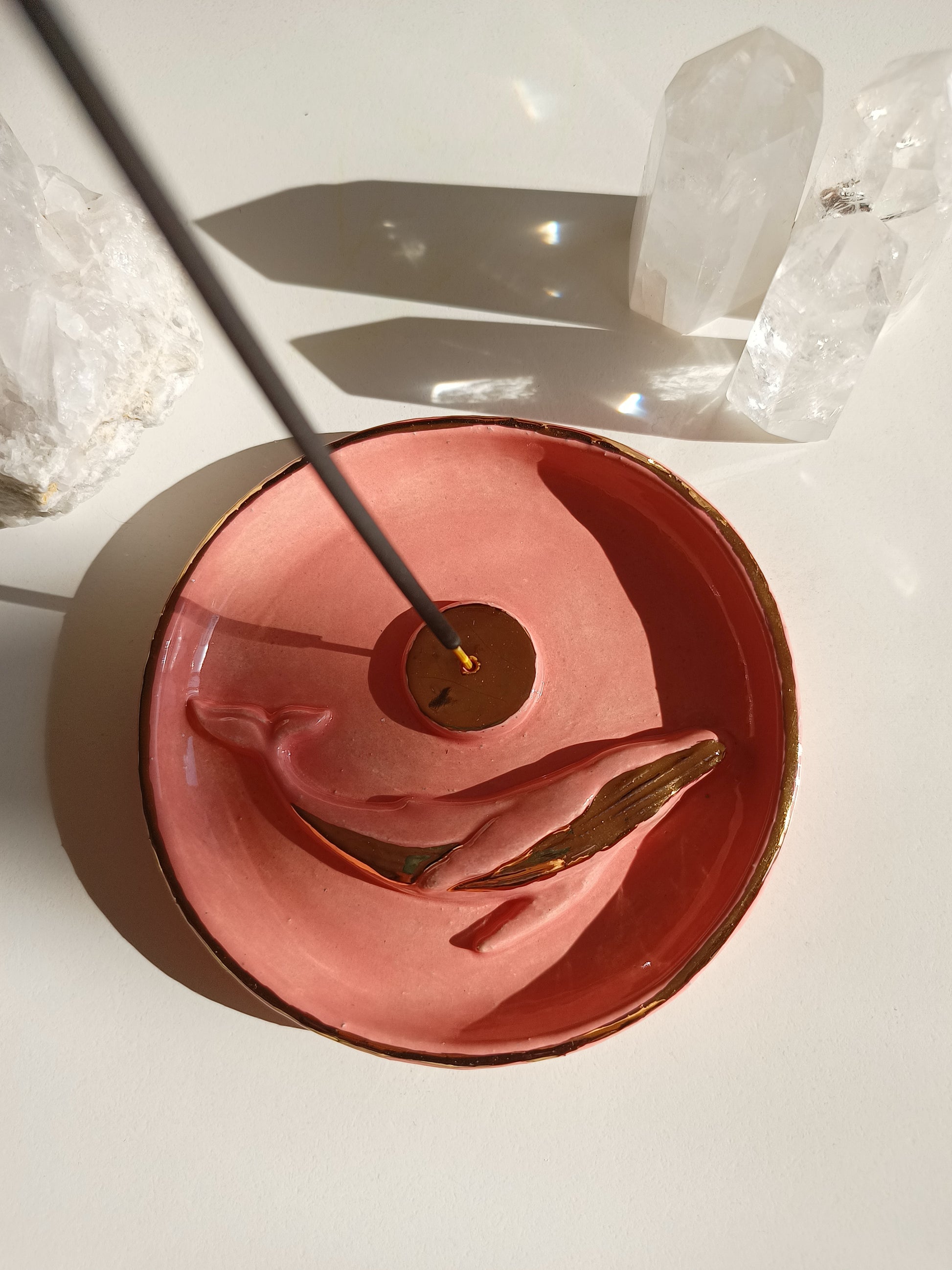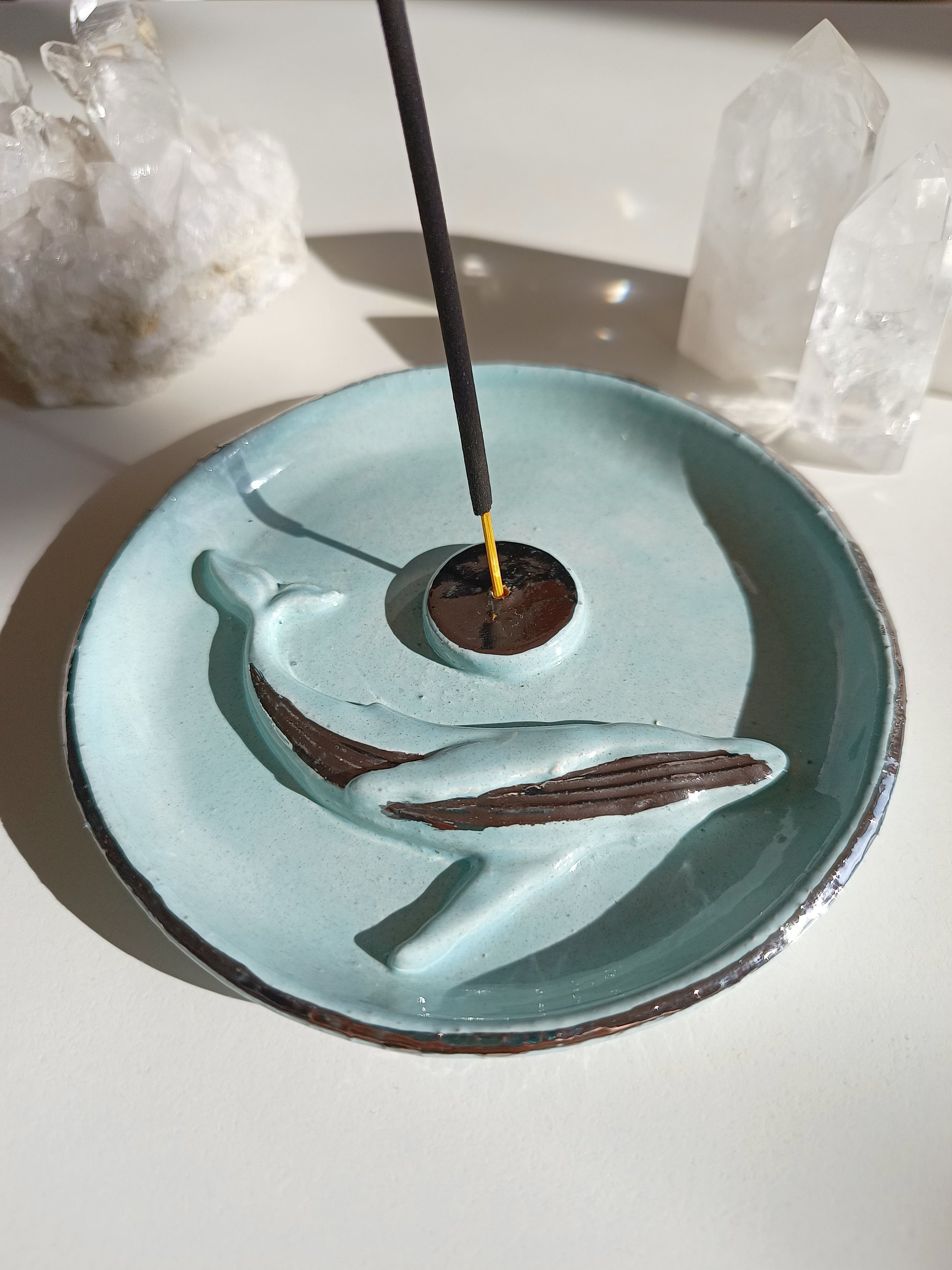 Una pieza ideal para dar un toque marino a tu espacio con una hermosa Ballenita 🐋. Además de porta incienso, puedes usarla como joyero, para dejar tus cristales, quemar tu palo santo, o solo para lucirla en tu rincón especial. Está hecha de cerámica de baja temperatura paper clay que te hará recordar la arena de mar. Con lustre de oro real, tiene el borde y los surcos ventrales de la ballena ✨.