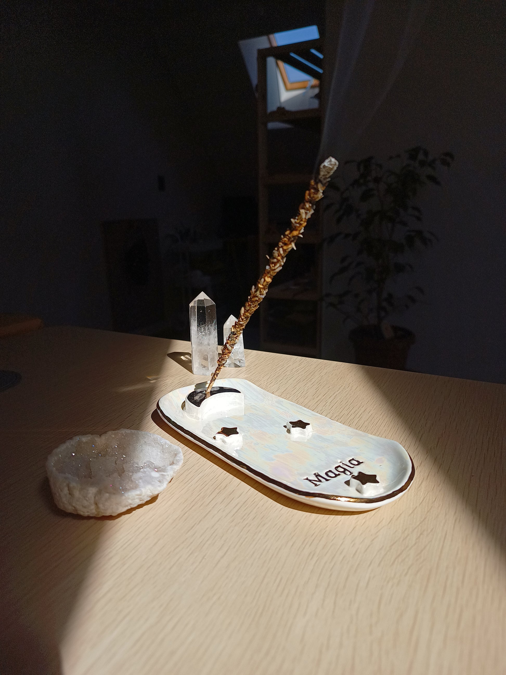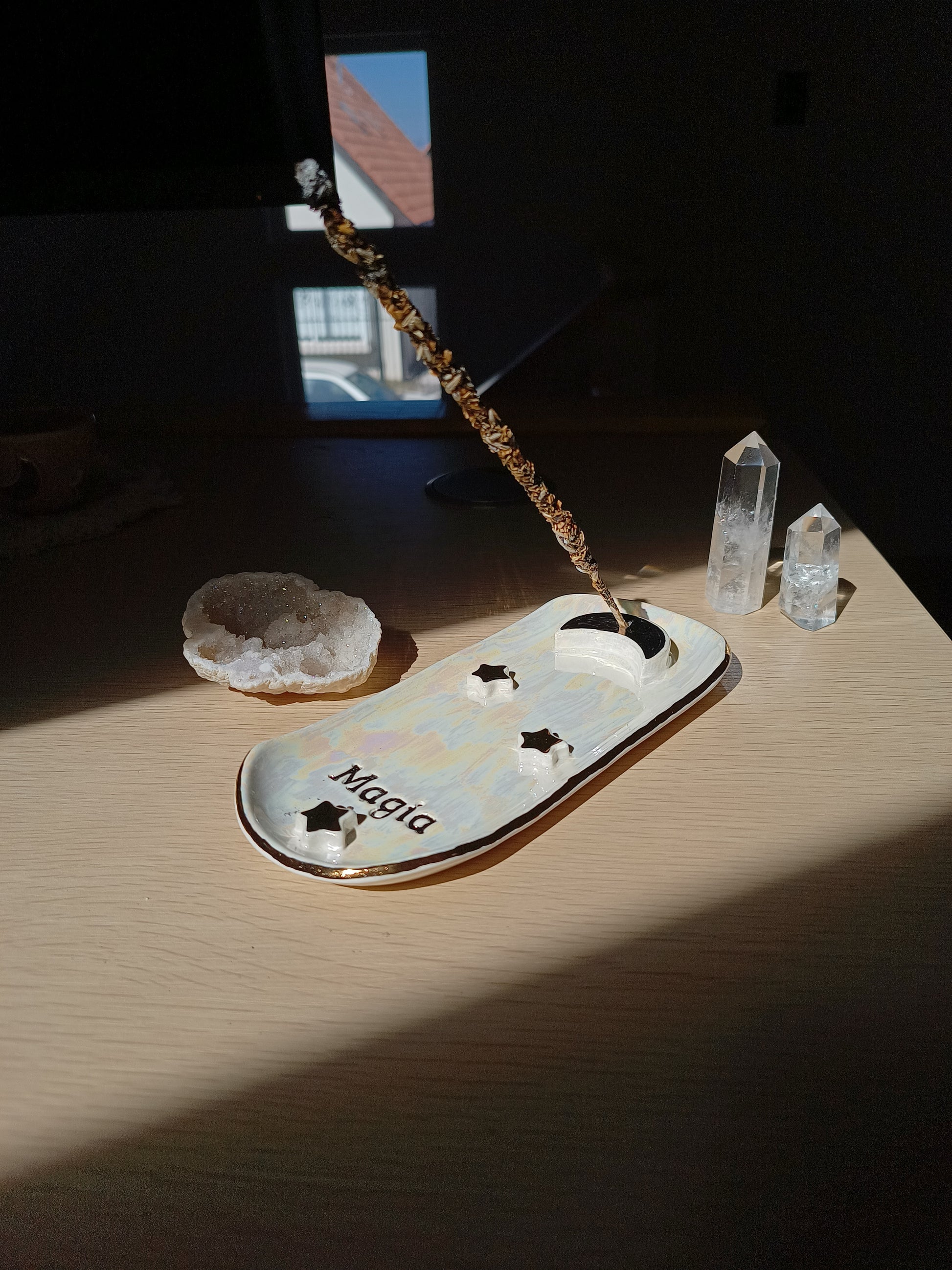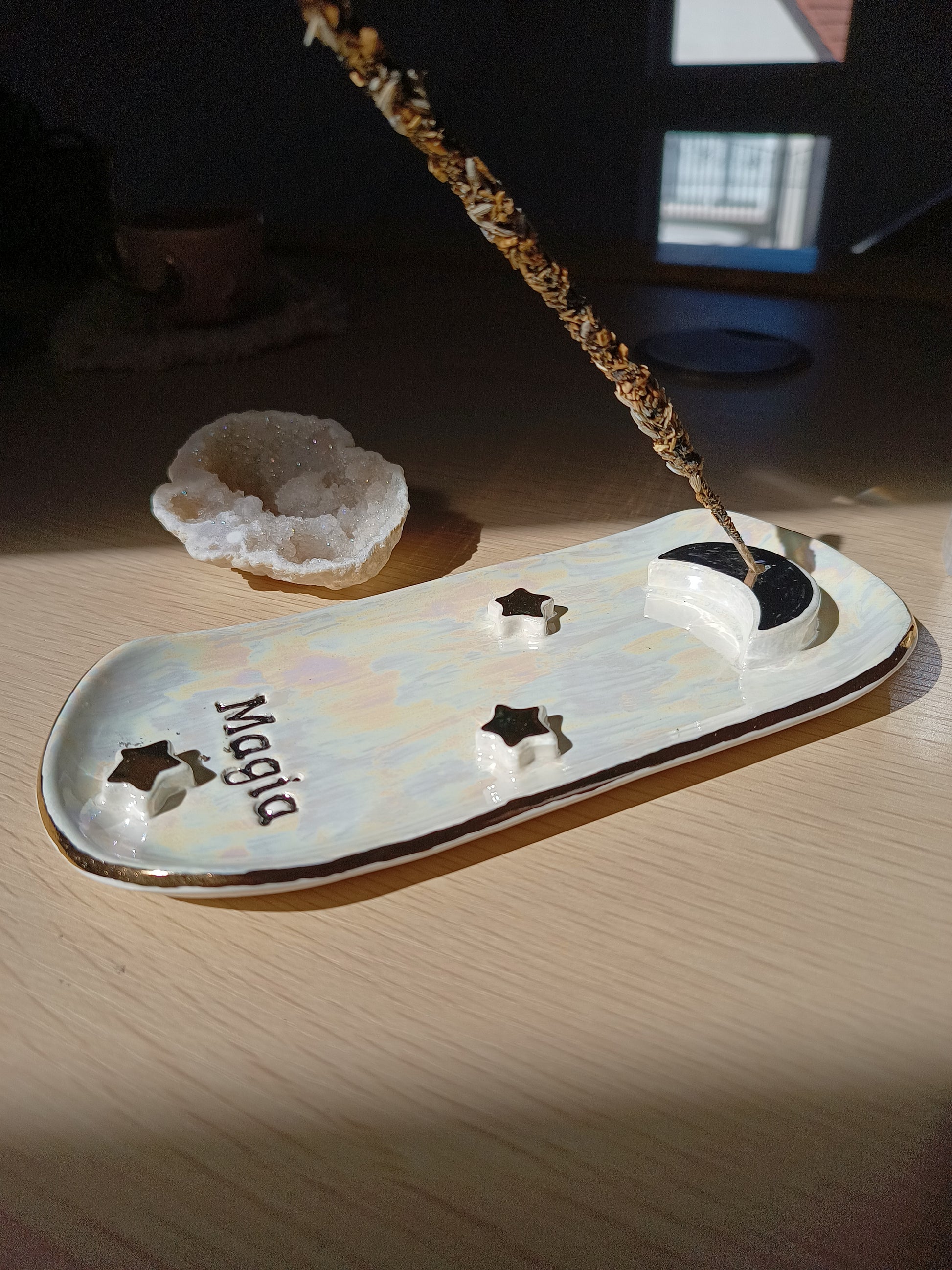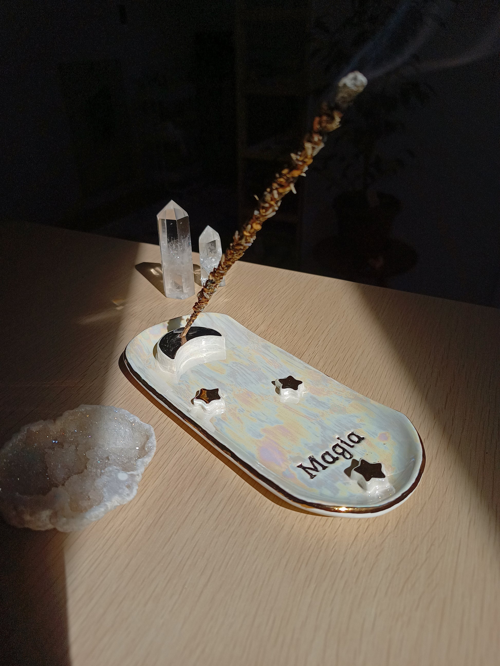 Si te gusta aromatizar tu espacio y te gustan las piezas delicadas y mágicas, este porta incienso es perfecto para ti 🌙. Esmaltado en distintos tonos que permiten destacar las estrellas, una hermosa luna, y una palabra para inspirarte. Está hecho de cerámica de baja temperatura y con detalles en lustre de oro real. ✨