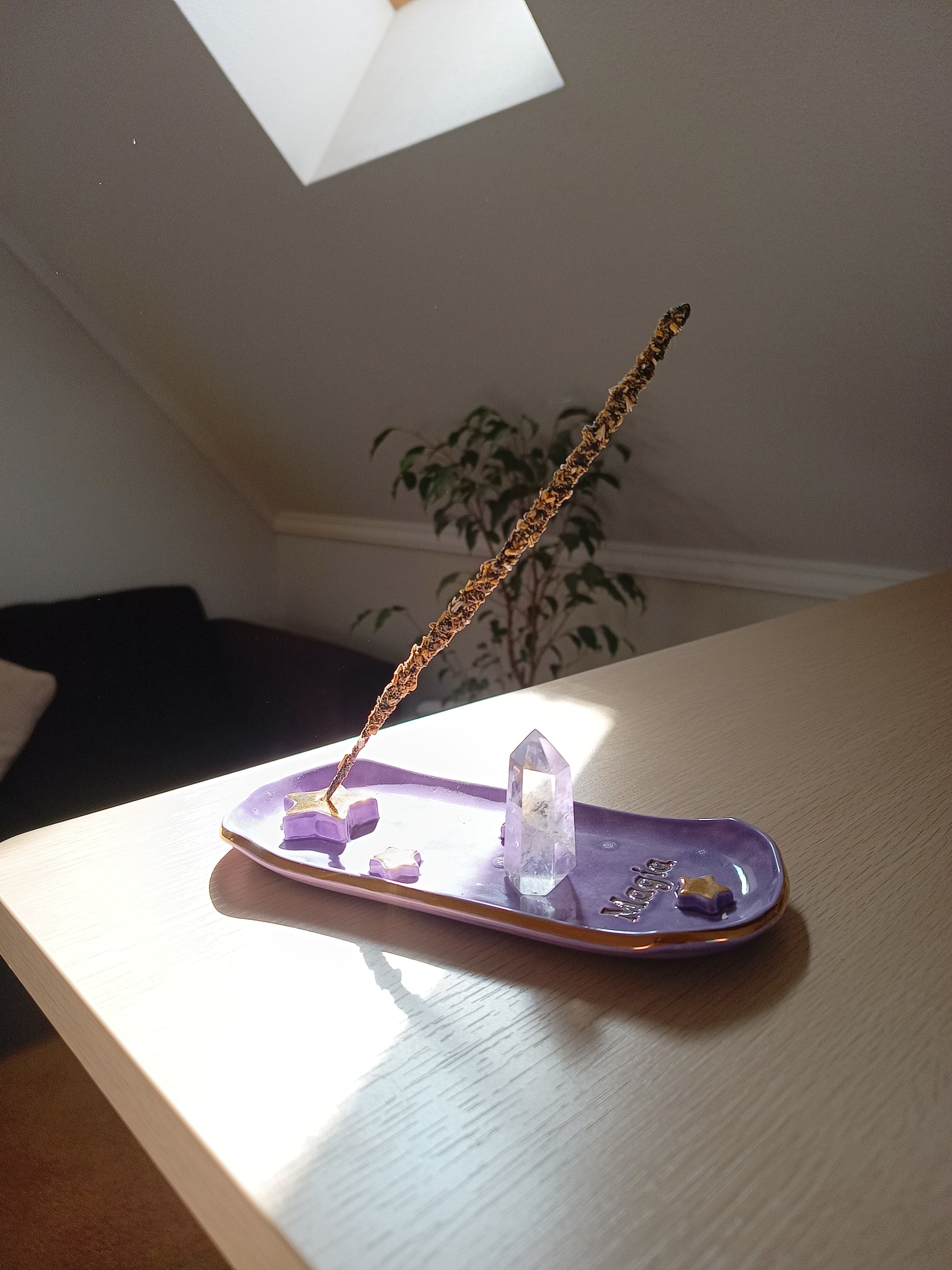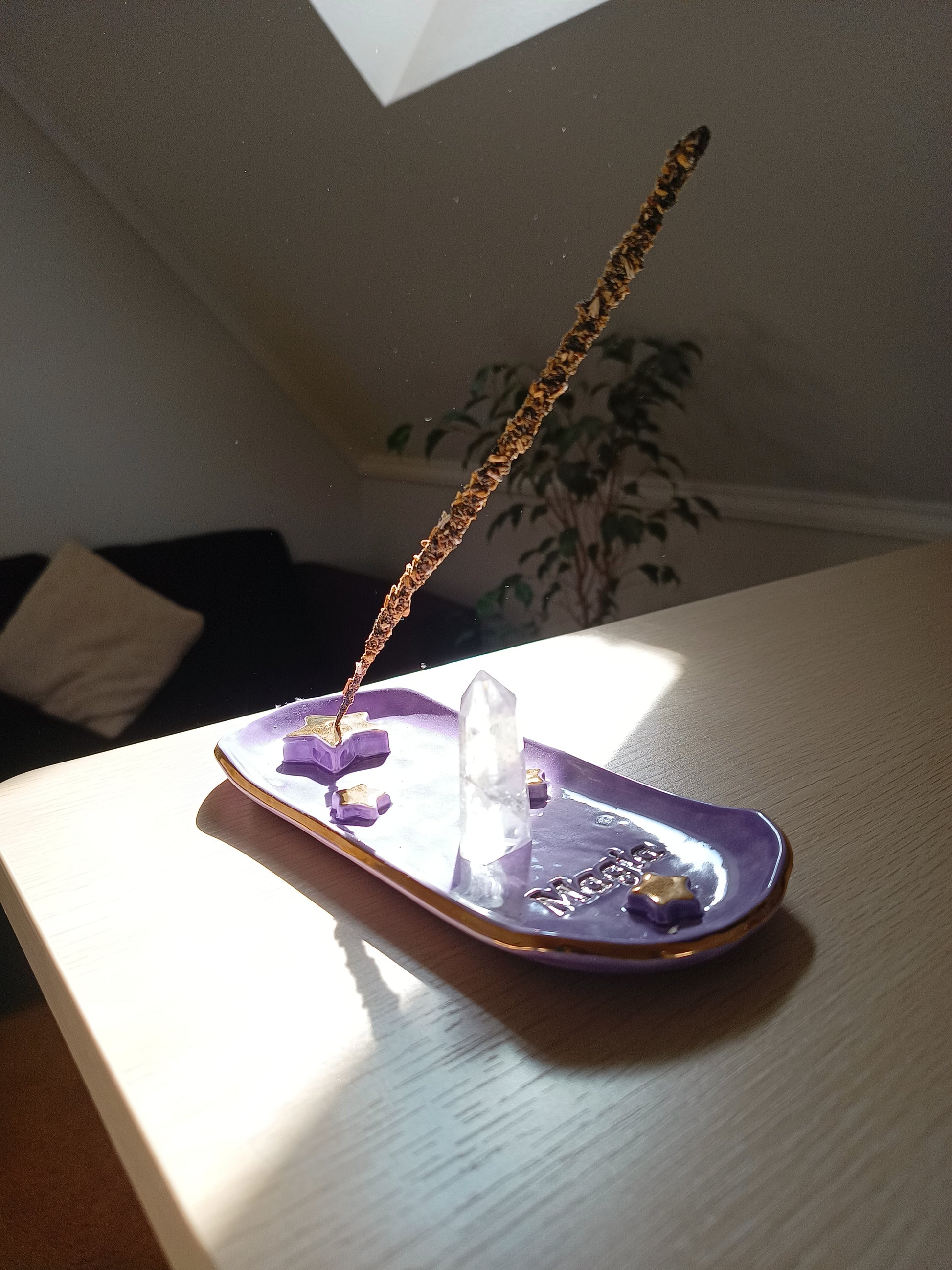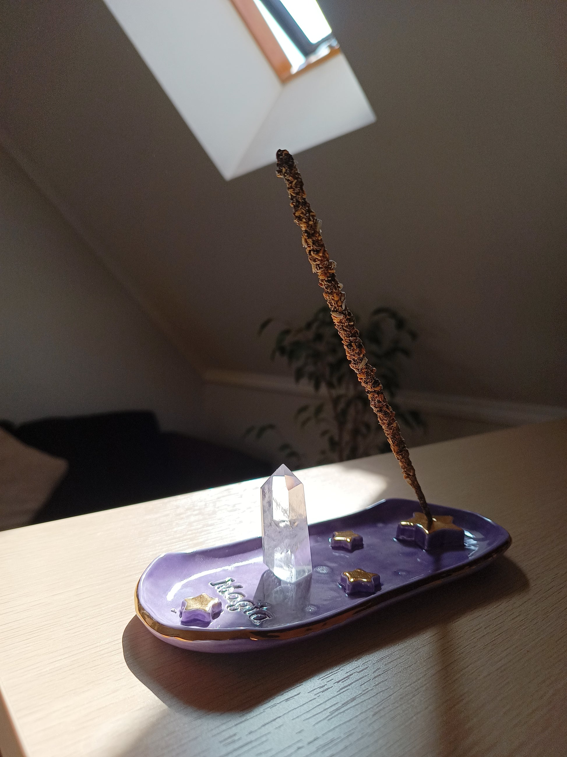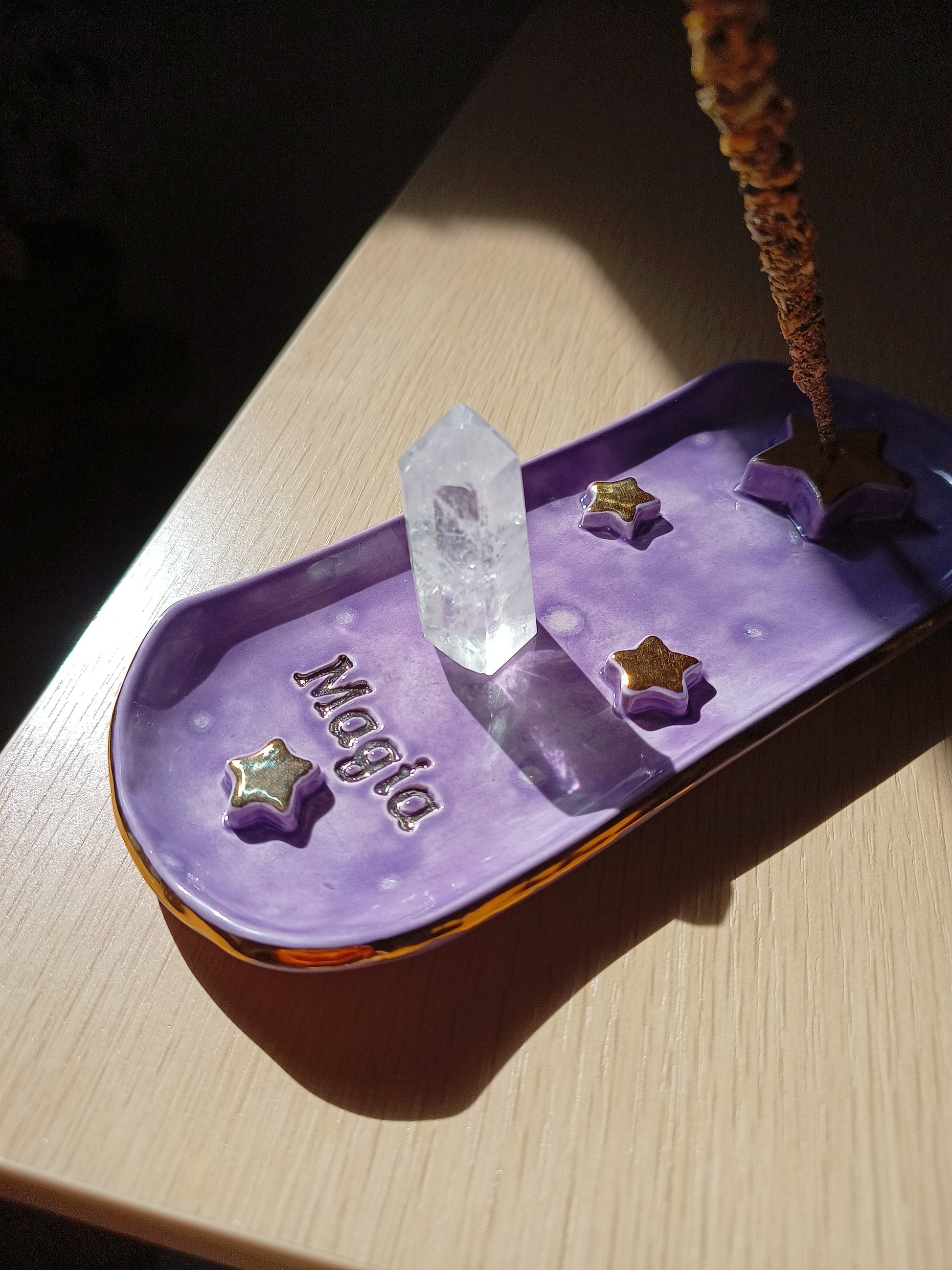 Si te gusta aromatizar tu espacio y te gustan las piezas delicadas y mágicas, este porta incienso es perfecto para ti 🌙. Esmaltado en distintos tonos que permiten destacar unas hermosas estrellas y una palabra para inspirarte. Está hecho de cerámica de baja temperatura y con detalles en lustre de oro real. ✨